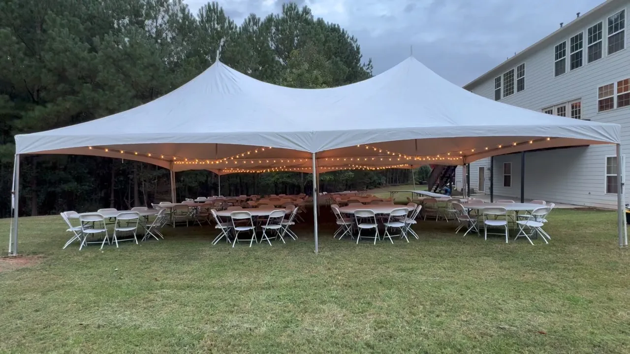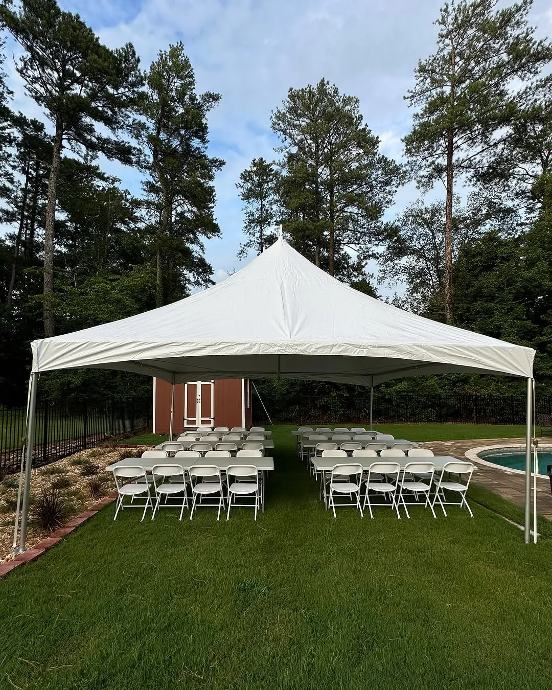 For this setup, DKG Rentals set-up a 20x20 high peak fream tent, 6 rectangular tables, and 48 regular white foldable chairs.