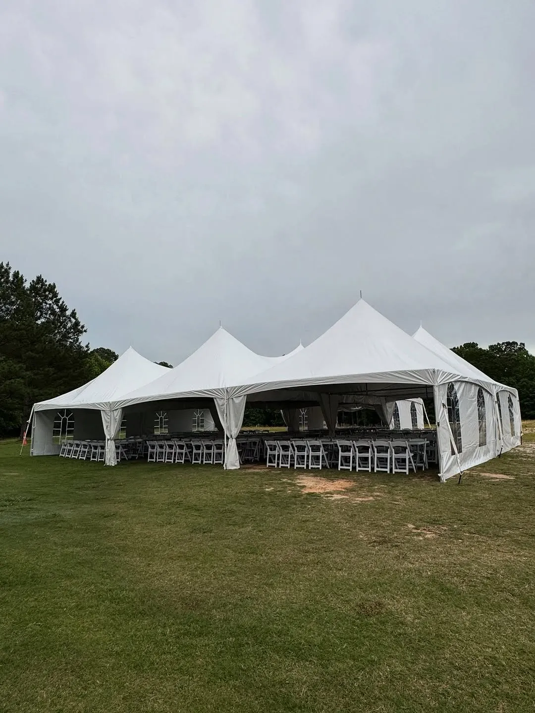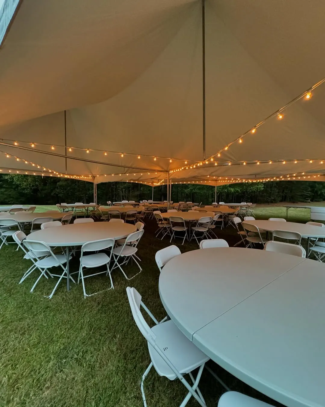For this setup, DKG Rentals set-up a 40x40 high peak frame tent with tent lights, 14 round tables, and 112 regular white foldable chairs.